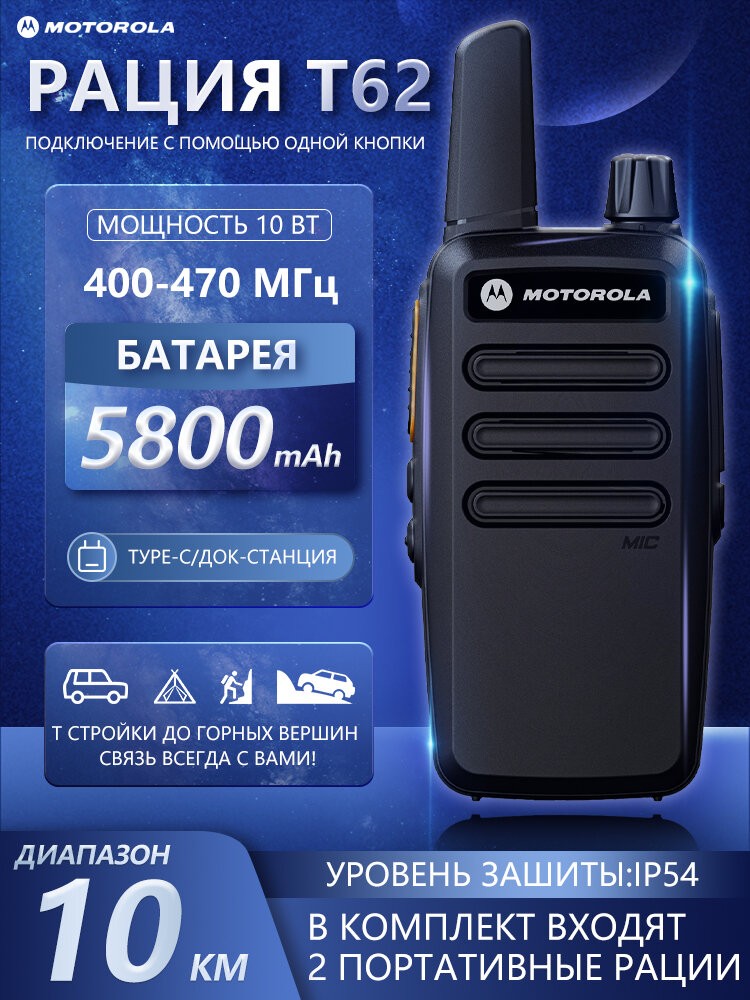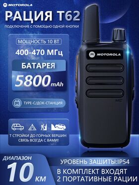 Аналоговая портативная рация Motorola T62; комплект из двух устройств; УВЧ: 400-470 МГц;