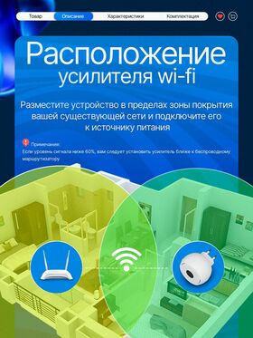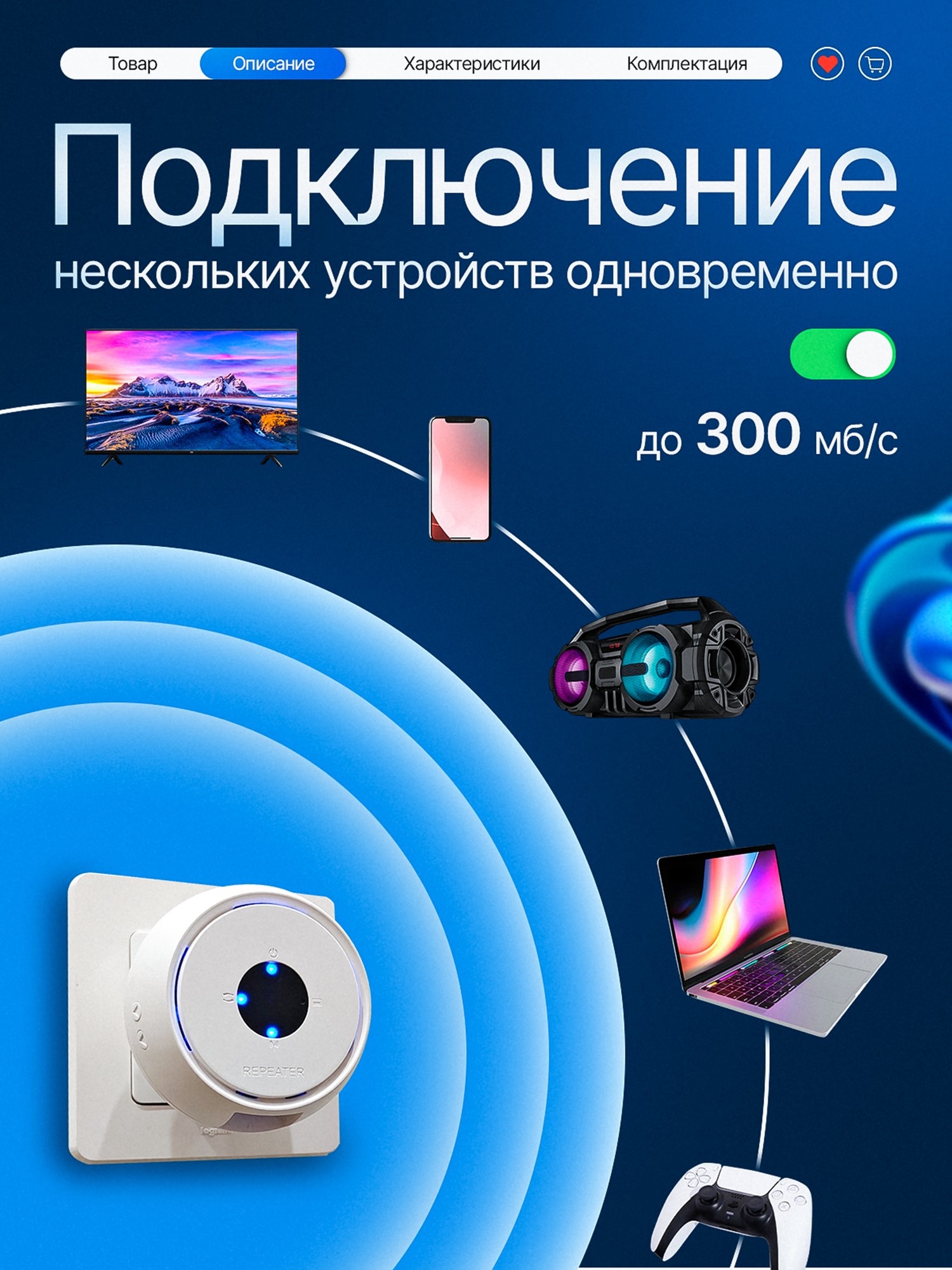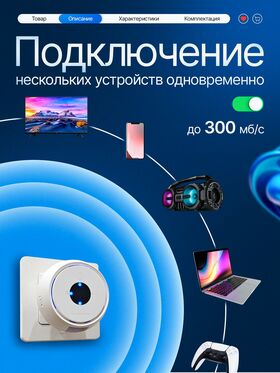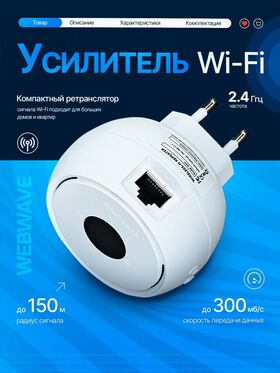 Компактный и незаметный ретранслятор сигнала Wi-Fi для больших домов и квартир. Наш усилитель WiFi работает на частоте 2,4 ГГц. Скорость передачи данных доходит до 300 Мбит/с. Настройка занимает 1-2 минуты. Репитер специально разработан для решения проблем с нестабильным сигналом и мёртвыми зонами в вашей сети. Если вы часто сталкиваетесь с тем, что связь с Wi-Fi становится слабее или вовсе пропадает, то наш ретранслятор-усилитель Wi-Fi будет идеальным решением для Вас. Он позволяет обеспечить достаточно широкую зону покрытия до 50 метров, что является весьма впечатляющим показателем. Одним из важных преимуществ нашего усилителя Wi-Fi является его беспроводной характер. Это значительно упрощает процесс установки и позволяет вам использовать усилитель в любом месте, где вам необходимо усилить Wi-Fi сигнал. Наш ретранслятор вай фай идеально впишется в любой интерьер, не привлекая слишком много внимания.