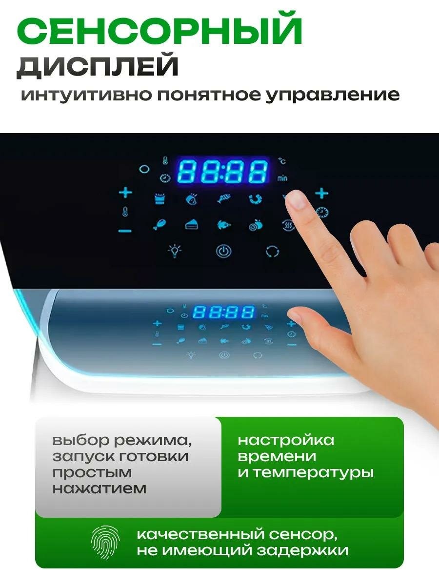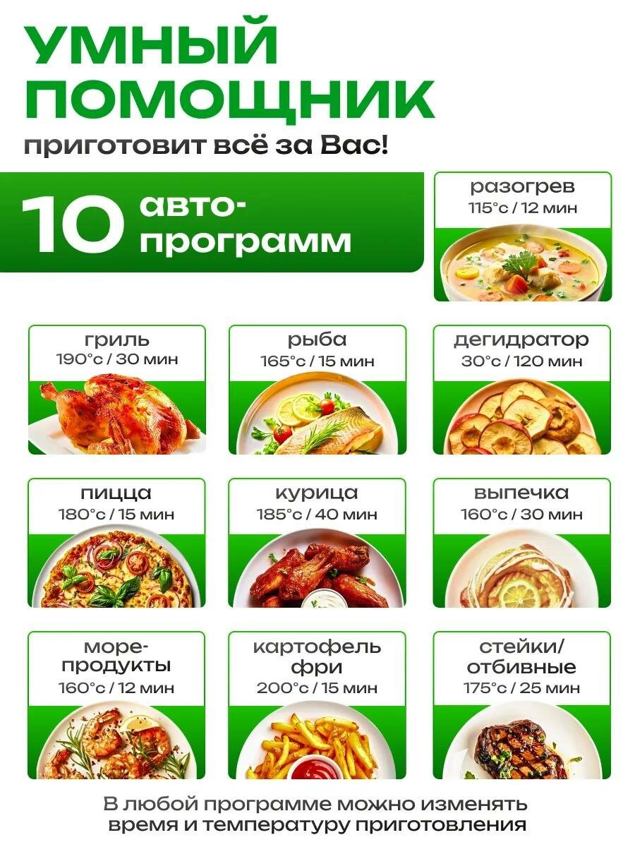 Домашняя кулинарная станция с высокой мощностью готовит быстрее духовки, позволяет использовать меньше жира и масла. Вы можете приготовить в аэрогриле любую еду: сочный стейк и котлеты, шашлык и рыбку, выпечку и десерты. Готовьте пиццу маленького размера из замороженного теста, бутерброды для запекания с целью перекуса на завтрак, шаурму, наггетсы или морепродукты, в том числе креветки. Полезный прибор - электропечь с интенсивной подсветкой и сенсорными кнопками для включения / смены режимов заменит духовку, фритюрницу и гриль, мини-печь и дегидратор и микроволновую печь (микроволновку для подогрева - разогрева еды) и шашлычницу. Функция сушилки сохраняет максимум вкуса и аромата, полезные микроэлементы.