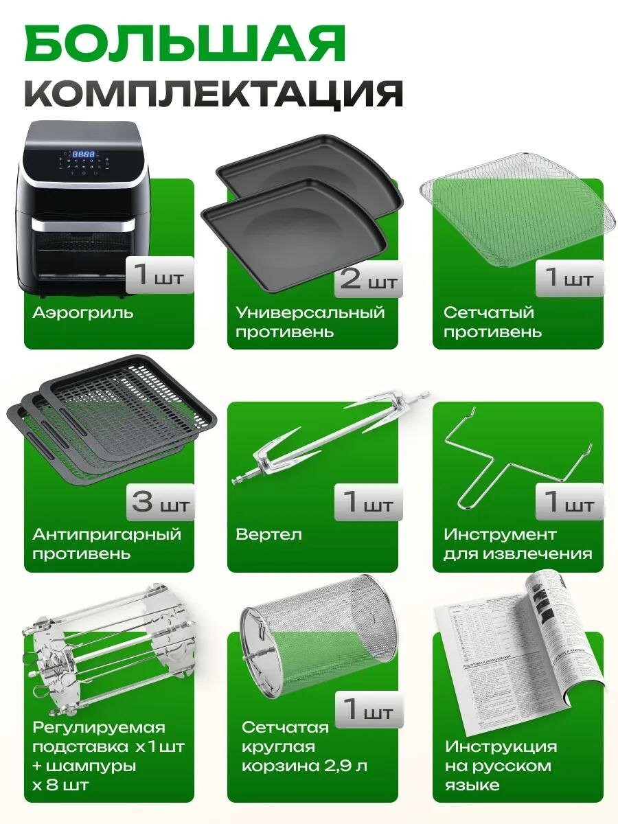 Настольный аэрогриль - это функциональный электрический прибор с легким управлением, который позволит готовить вкусные блюда как в ресторане у вас дома. Комплект включает сам прибор и противень с рабочей поверхностью в виде защитного антипригарного покрытия (3 штуки), съемный поддон - лоток для сбора капель (2 штуки), сетчатую решетку для овощей - гриль, сушеных фруктов или вяленого мяса, регулируемую подставку для металлических шампуров и сами шампуры (8 штук). Также в наборе аксессуары: сетчатая корзина (2.9 литра) круглой формы для готовки картошки (картофеля - фри), вращающийся вертел с ручками, инструмент для извлечения, а также инструкция и фирменная коробка.