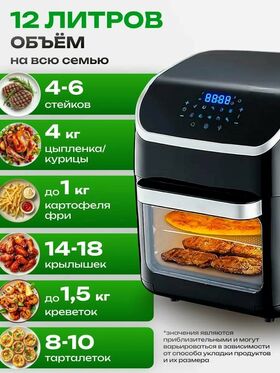 Мультипечь с технологией циркуляции горячего воздуха и большим экраном с множеством электронных программ упростит и ускорит повседневный процесс приготовления различных блюд. Профессиональная бытовая техника в стильном дизайне с корпусом черного цвета и дверцей с прозрачной крышкой будет удобна в домашних и дачных условиях, стильно впишется в интерьер. Аэрогриль электрический 12 литров- это универсальный подарочный вариант на любой праздник! У нас есть акции и распродажи, вы можете купить наши товары в подарок со скидкой!