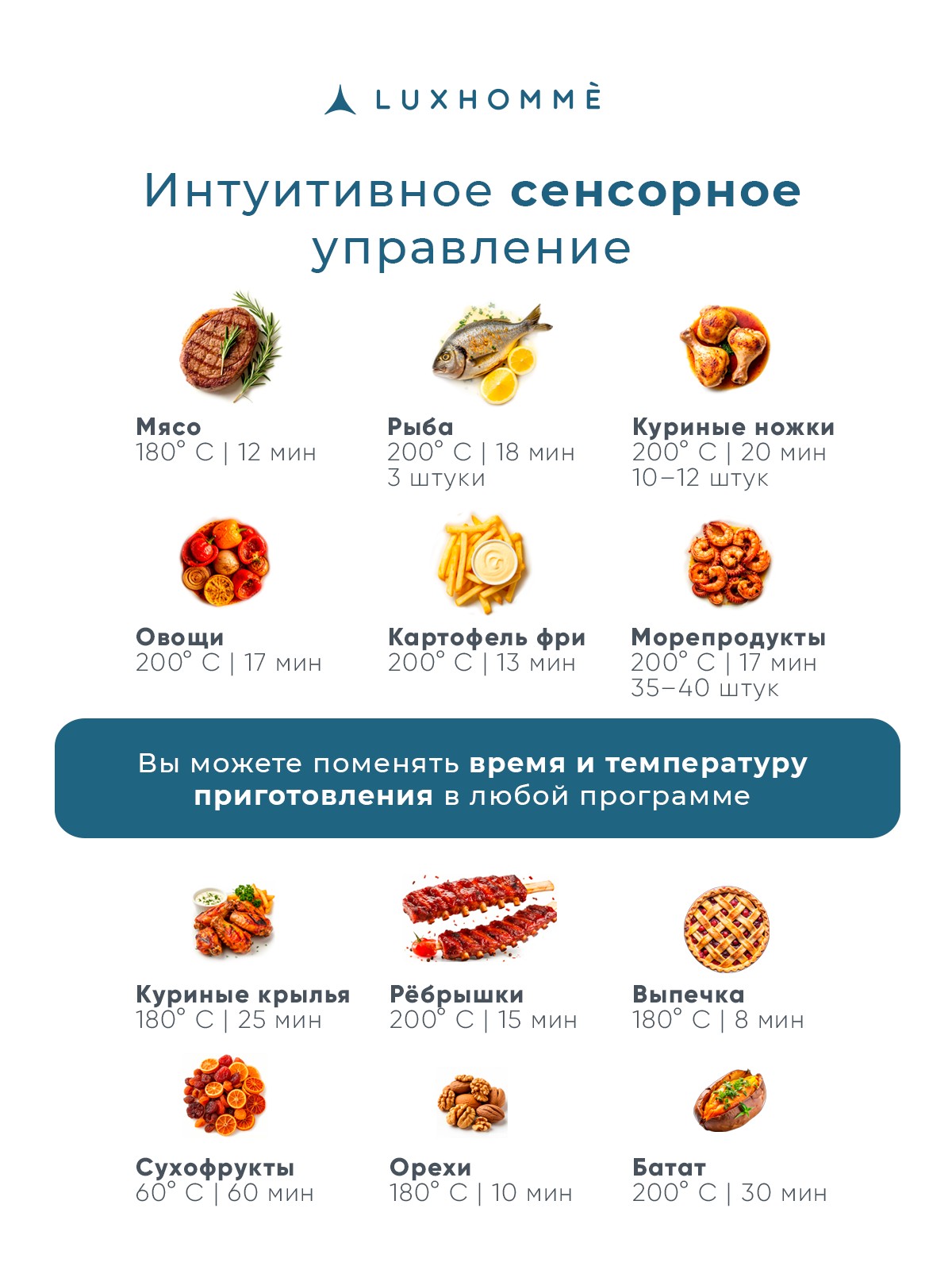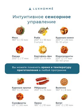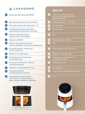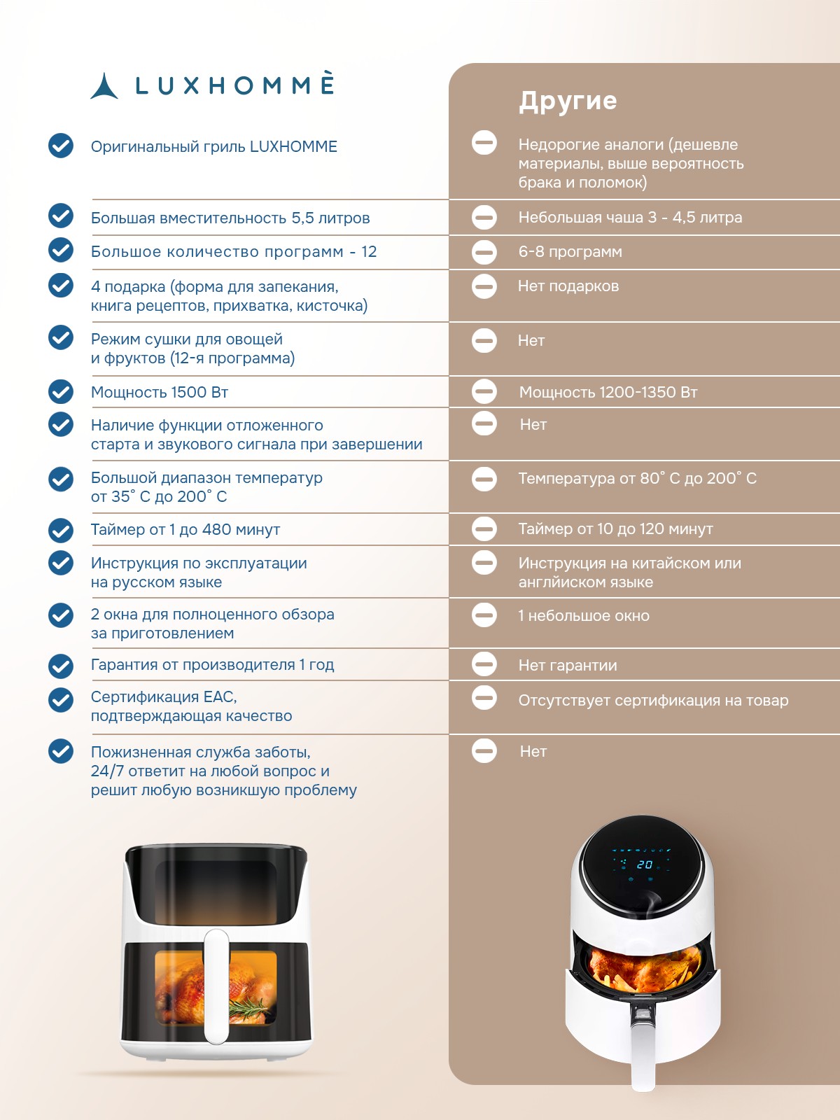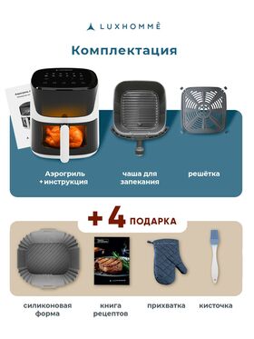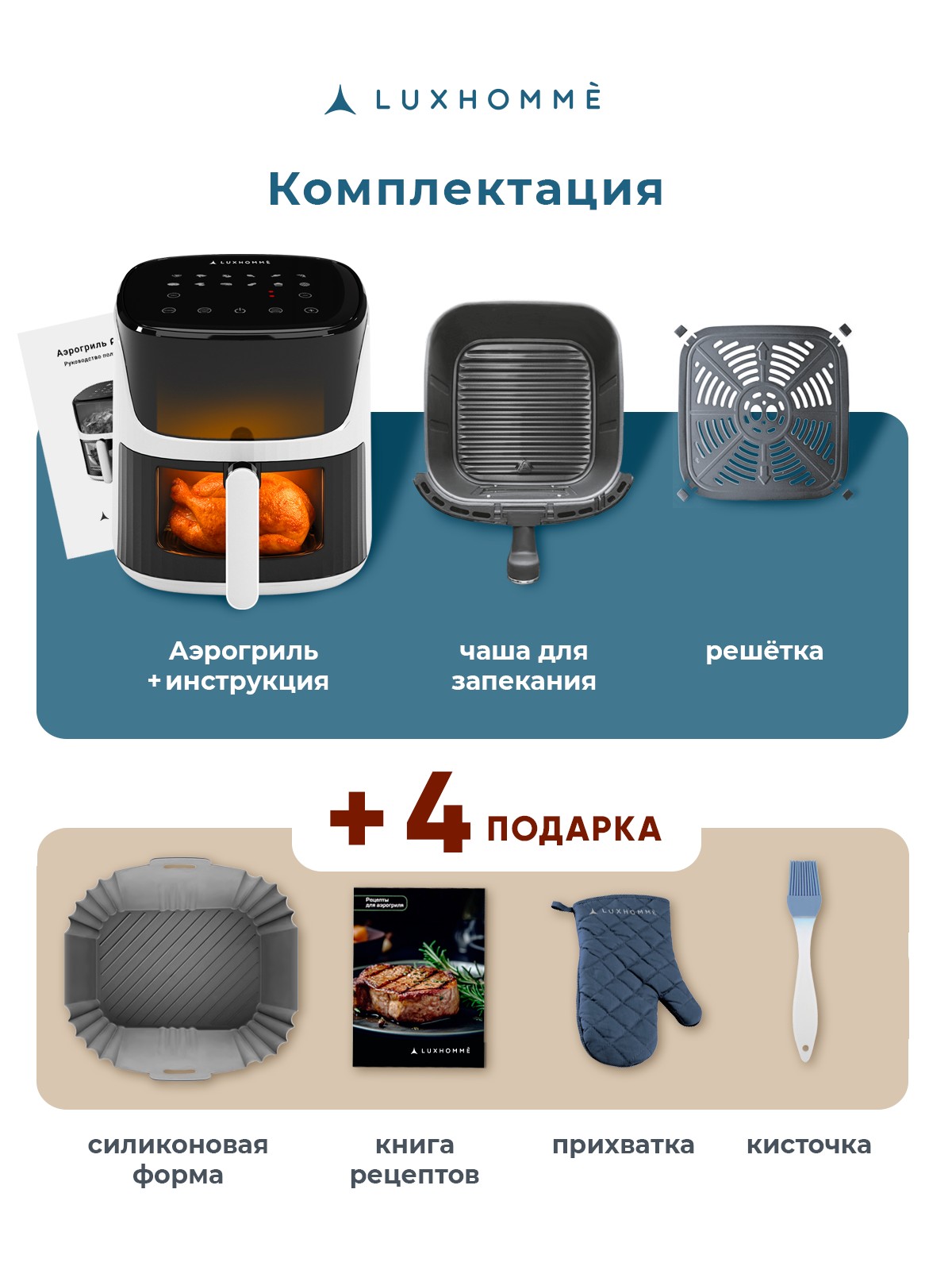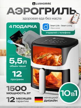 Электрический аэрогриль – это универсальная бытовая техника для кухни. Это профессиональное кухонное устройство для дома поможет приготовить вкусную и здоровую пищу без масла и жира. Наша умная грильница на 5,5 литров имеет 12 программ приготовления для курицы, мяса и других блюд и идеально подходит для больших семей. Высокая мощность гриля 1500вт обеспечит быстрый и эффективный процесс приготовления пищи. Благодаря интуитивному сенсорному управлению аэрофритюрницы и нашей книге рецептов для аэрогриля, Вы сможете сделать для себя новые гастрономические открытия.
