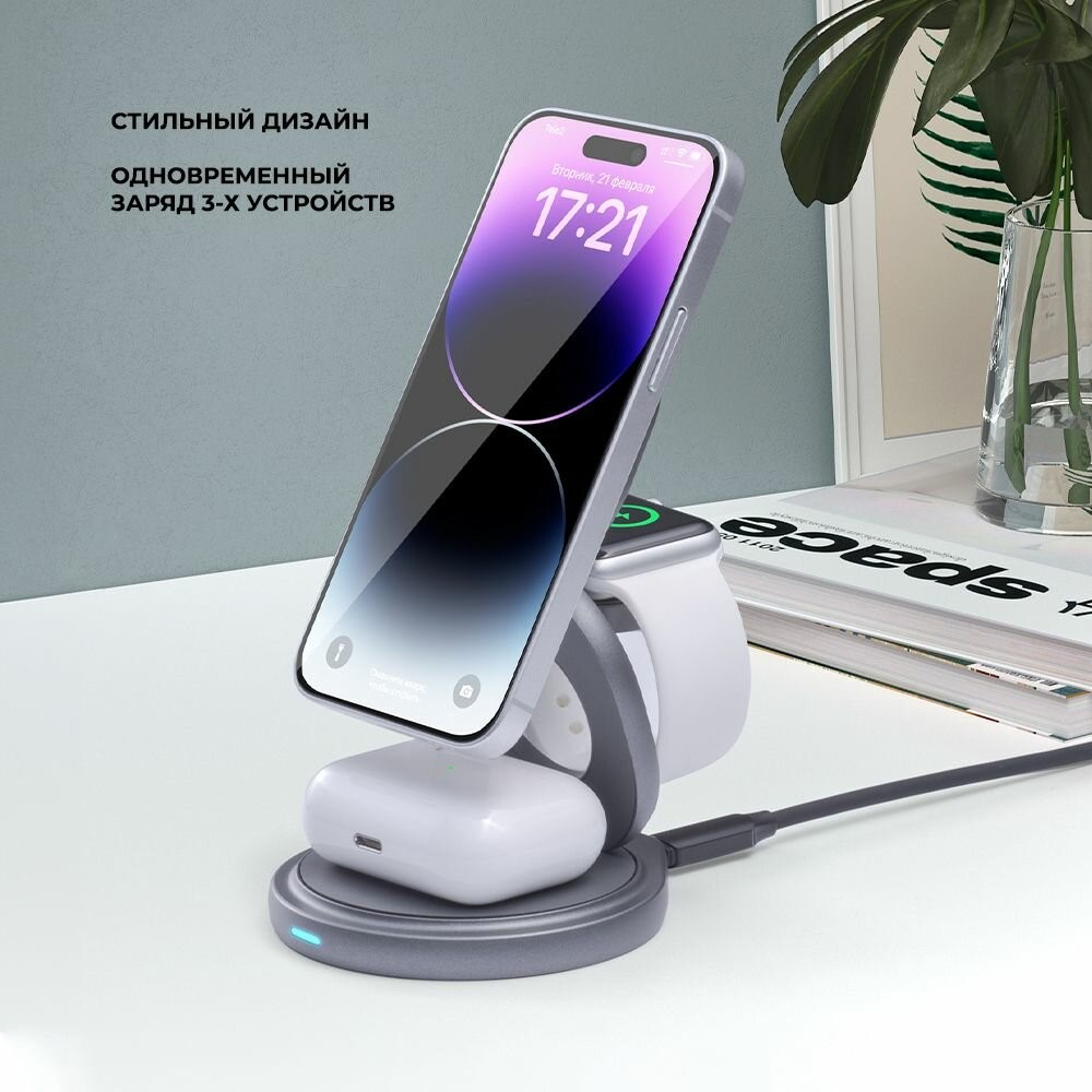 Складная беспроводная зарядная станция Rotation QI 3 в 1 от Deppa позволяет заряжать смартфон на максимальной допустимой мощности до 15Вт, наушники — до 5Вт, Apple Watch — до 2.5Вт.