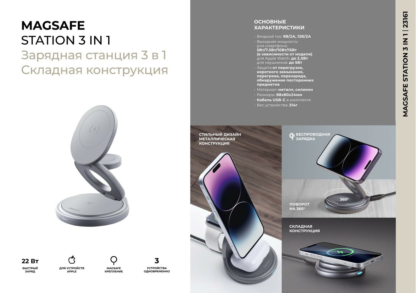 Подставка c креплением и вращением на 360 градусов имеет встроенную защиту от перегрузок, короткого замыкания, перегрева и перезаряда.