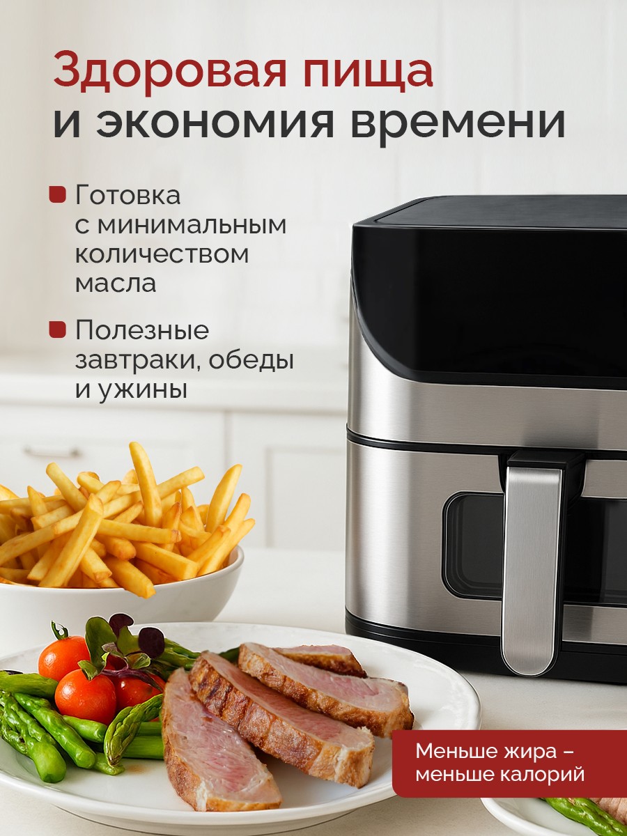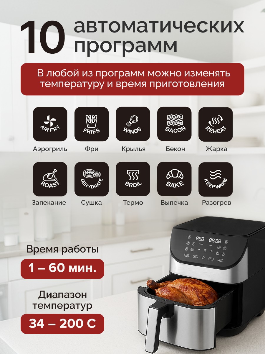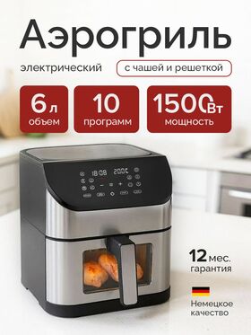 Аэрогриль электрический объемом 6 литров оснащен сенсорной панелью управления и мощностью 1500 Вт, что обеспечивает быстрое и равномерное приготовление пищи.