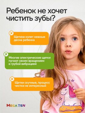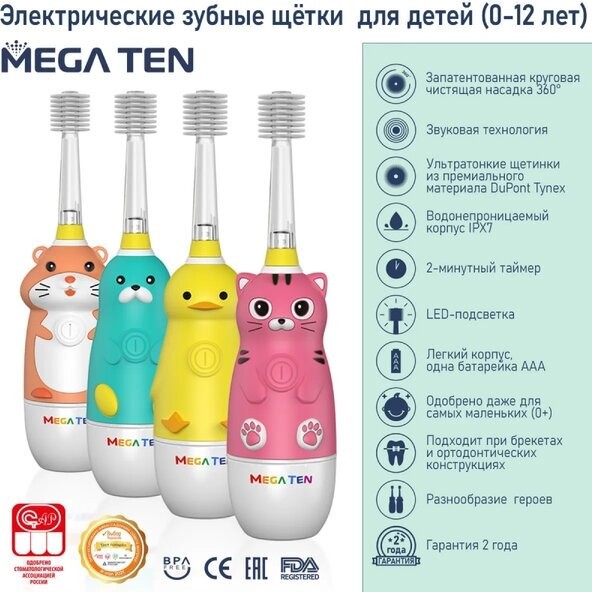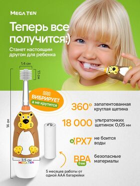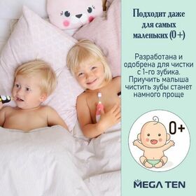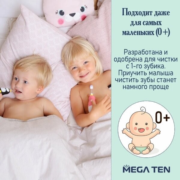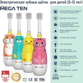 Электрощетка MEGA TEN - идеальное решение для родителей, заботящихся о здоровье детей с первого зуба до 12 лет. Отлично подходит для приучения маленького ребенка к чистке зубов. Электрозубная щетка обеспечит бережный, полноценный уход и гигиену за полостью рта. Подарит зубам здоровье с помощью запатентованной НЕВРАЩАЮЩЕЙСЯ круговой насадки с 18 000 ультратонкими щетинками из премиального нейлона DuPont Tynex. Детская зубная щетка с почти бесшумной вибрацией, эффективно очищает, подходит для чистки труднодоступных мест, для удаления налета, зубного камня, от кариеса зубов. Зубная щетка с насадками стильная, умная, эстетичная, милая, красивая и непременно привлечет внимание малышей. За счет этого чистка зубов будет проводиться весело и без слез. Электро щетка ортодонтическая, автоматическая, вибрационная, аккумуляторная, портативная, инновационная, оригинальная, многощетинковая, механическая, профессиональная и нового поколения чистит в 2 раза лучше обычных. Мягкая, звуковая, не ультразвуковая, отбеливающая. Зубная щетка 3д с тонкими щетинками является единственной в своем роде, можно использовать для новорожденных с первых зубов от 0 лет как первая зубная щетка. Круглая насадка за одно движение очищает 4 зоны – зубы, десны, язык и внутреннюю поверхность щек. Подходит для чувствительных зубов и десен, может использоваться при ношении брекетов, элайнеров, капп, коронок и др. Зубная щетка 360 градусов электронная с чистящей головкой подойдет как для младенца, так и подростка, для девочек и для мальчиков в возрасте 0-3, 1+, 2, 3, 4, 5, 6, 7, 8, 9, 10, 11 и 12 лет.